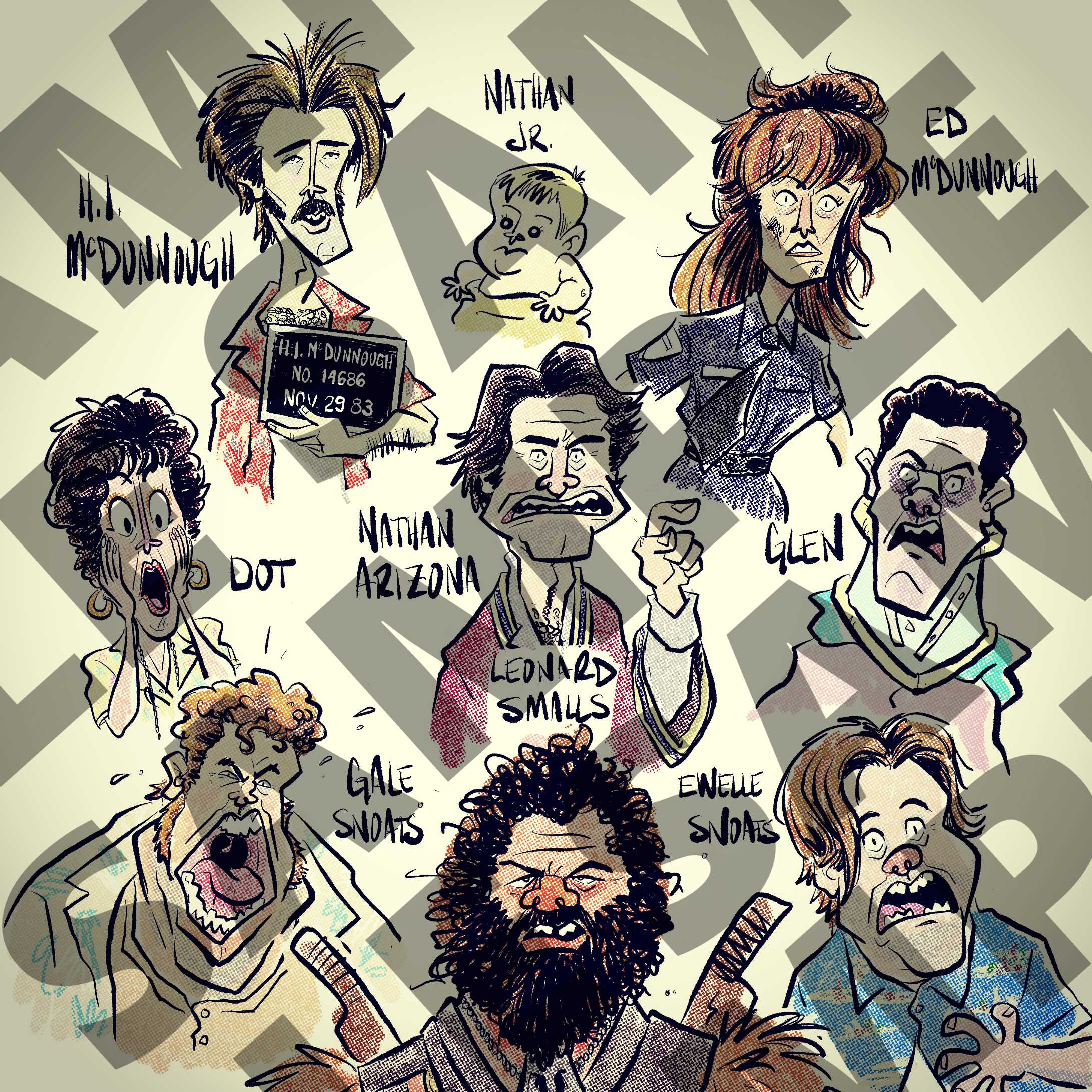 8" x 8" High quality print of the cast of the 1987 film "Raising Arizona". Will come signed and numbered by the artist.